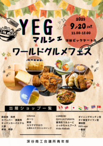深谷商工会議所青年部では、令和7年度埼玉県商工会議所青年部連合会「研修と交流の集い」深谷大会の開催に合わせ、『YEGマルシェ&ワールドグルメフェス』を開催します。